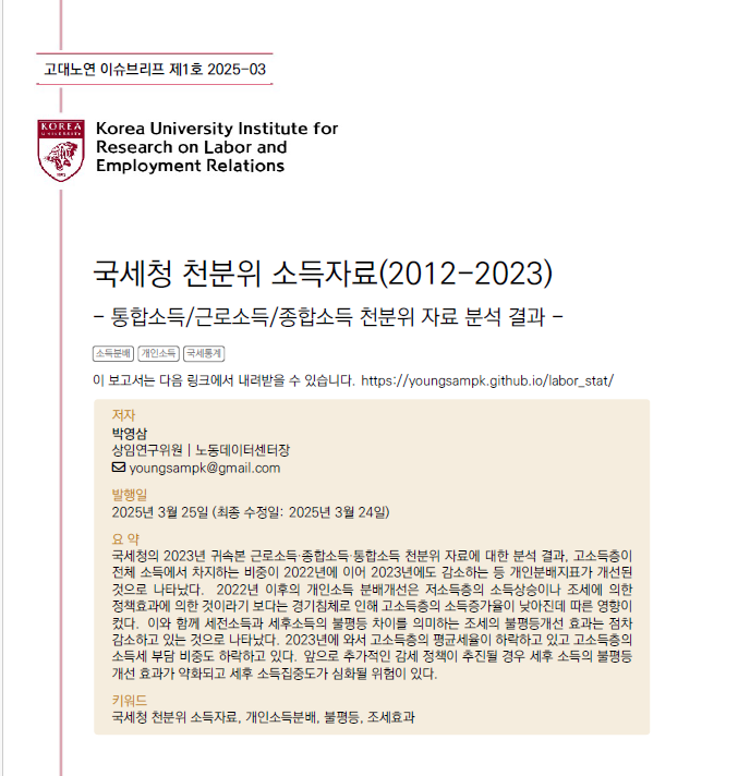 국세청에 신고한 최신 개인소득 통계들이 공개되고 있다. 국세청이 근로소득 연말정산과 종합소득 확정신고 결과를 집계한 통계를 공개했고, 2월부터는 국회에 제출한 소득 천분위 자료 분석 결과들이 공개되고 있다. 이 글에서 분석한 자료는 기존에 공개된 2012~2021년 자료에 최근 국세청이 윤건영 더불어민주당…