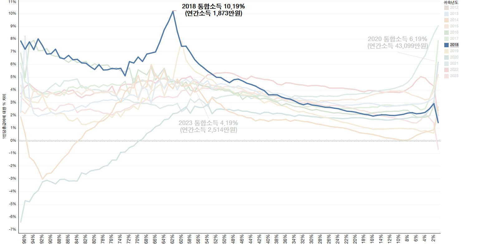 통합소득 상위10%가 전체 소득세에서 부담하는 비중은 2014년 80%를 차지했으나 하위90% 계층의 소득증가와 납세액 증가 등에 의해 2019년에 77.4%까지 하락했음. 2022년까지는 평균세율이 상승하는 추세 속에서 세액비중이 감소하였지만, 2022년 이후에는 평균세율이 하락하면서 세액비중이 감소하고 있기 때문에 이같은 추세가 지속될 경우 조세에 의한 불평등 개선효과는 점점 축소될 위험이 있음