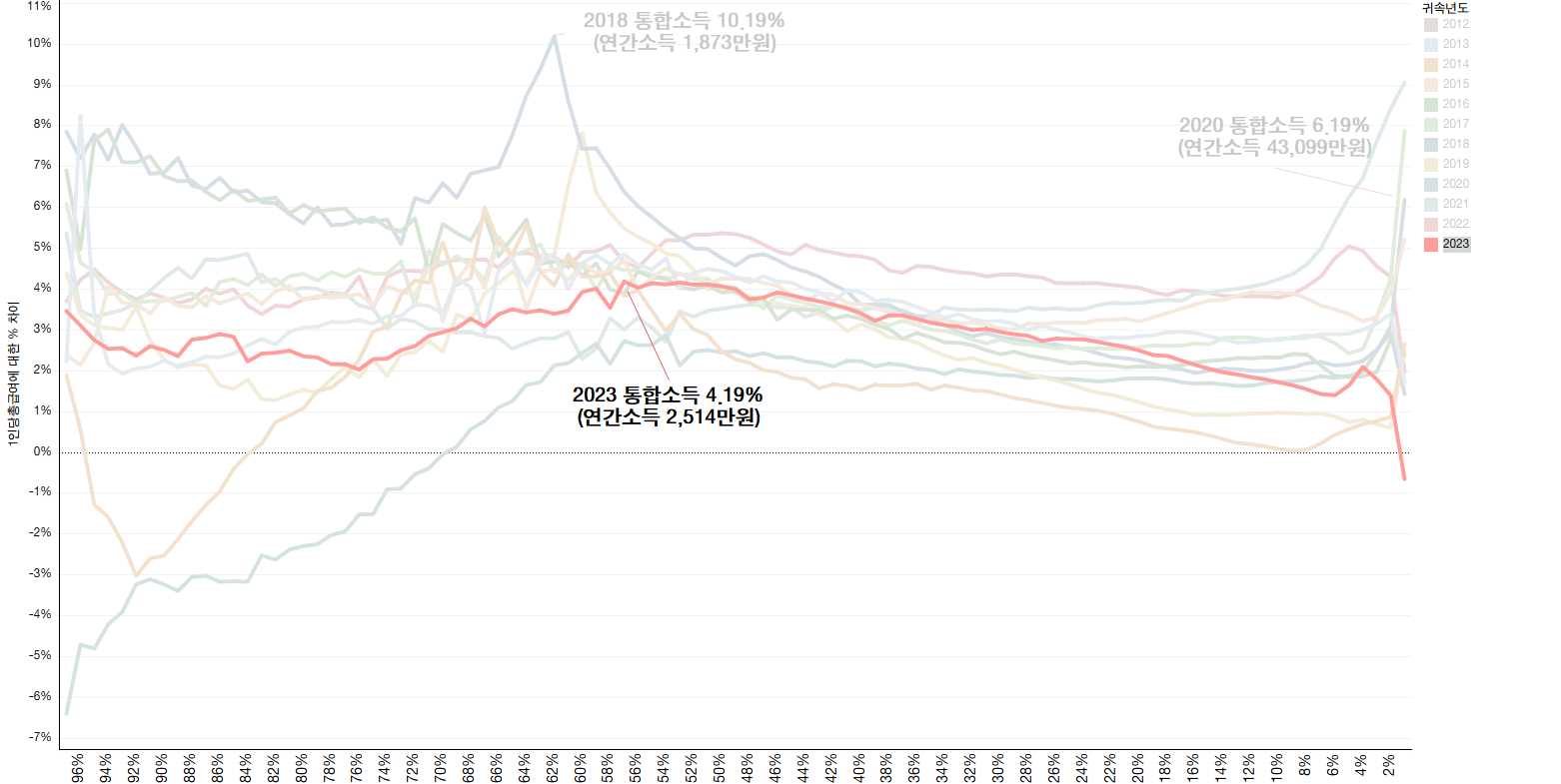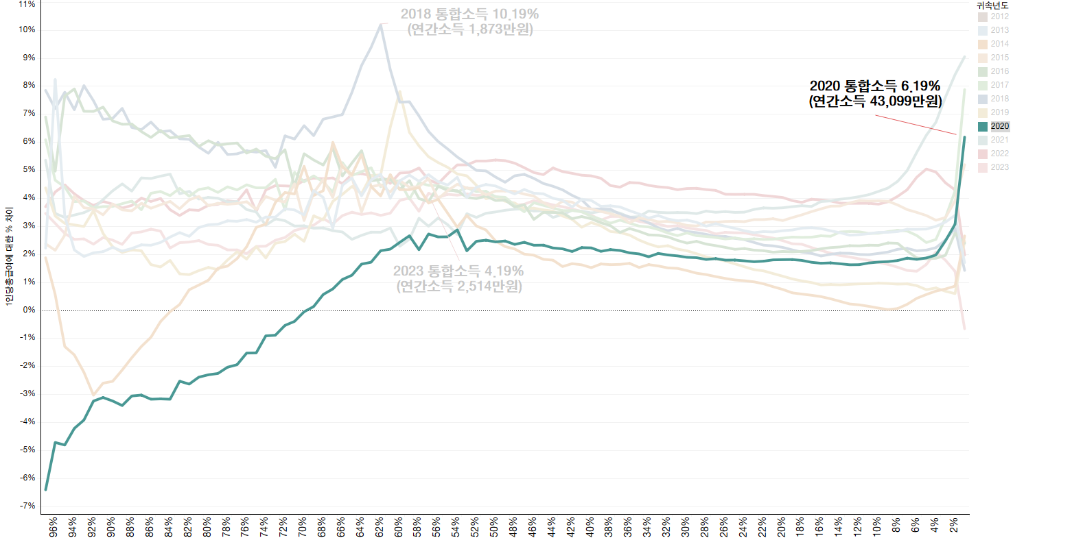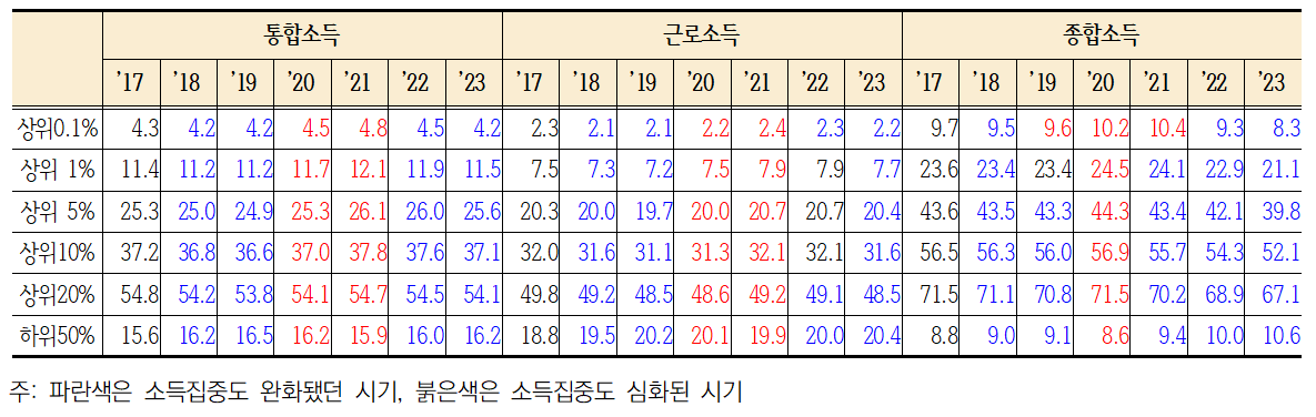 종합소득은 상위1%, 상위5% 소득비중이 2020년 한해 동안만 증가한 뒤에 2020~2021년 기간 동안 연속 하락했고, 최상위0.1% 점유비중도 2020년, 2021년 2년 연속 증가하기는 했으나 2022년과 2023년에 큰 폭으로 2년 연속(-0.9%p, -1.0%p) 다시 하락해 2017년 수준보다 전체적으로 상위소득계층 비중이 감소한 것으로 나타남