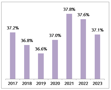 통합소득 상위10% 점유비중은 2017년 37.2%, 2018년 36.8%, 2019년 36.6%로 2년 연속 하락하다 2020년 37.0%, 2021년 37.8%로 2년 연속 증가했으며, 2022~2023년에 37.6%, 37.1%로 다시 완화 추세