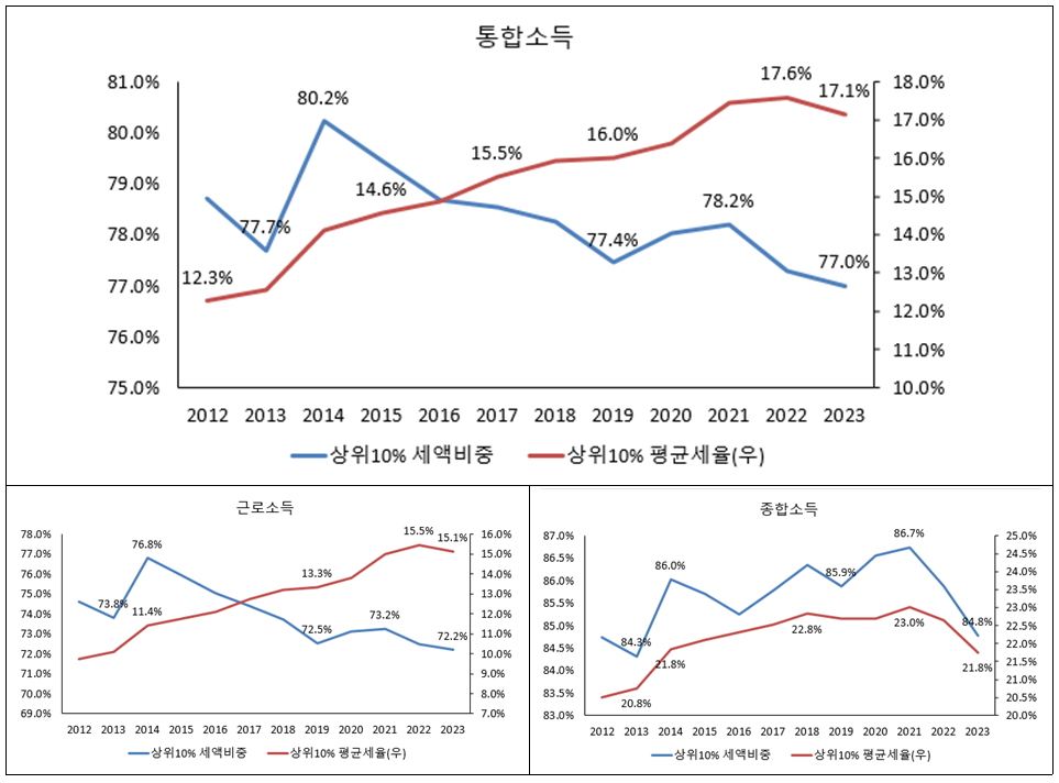 근로소득 상위10%가 근로소득세에서 부담하는 비중은 2014년 76.8%를 차지했으나 2019년까지 72.5%로 하락했음. 2022년까지는 평균세율이 상승하는 추세 속에서 세액비중이 감소하였지만 2022년 이후에는 평균세율이 15.5%에서 15.1%로 하락하면서 세액비중이 감소하고 있는 상황임