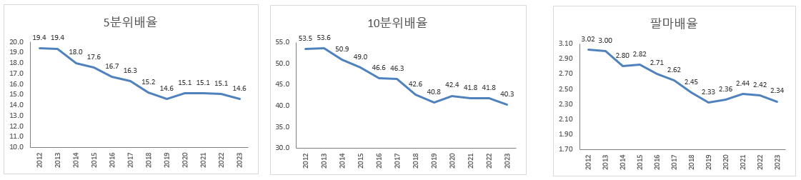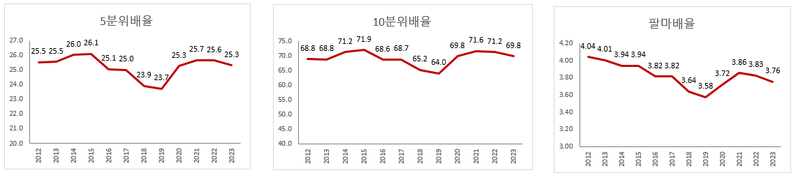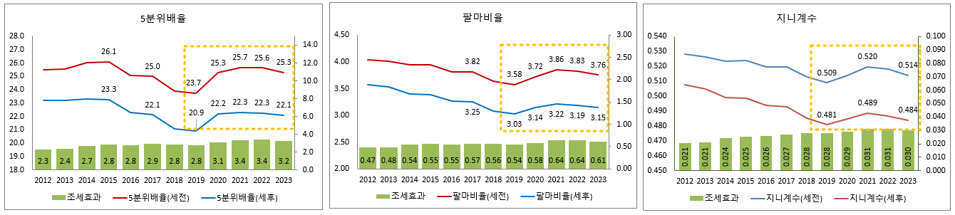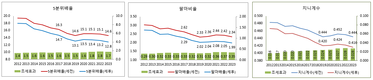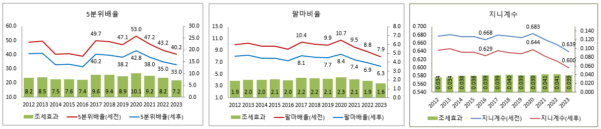 2021년 대비 2023년 세전 통합소득 5분위배율과 팔마비율은 각각 –0.37배, -0.10배 개선되었으나 세후 통합소득의 5분위배율과 팔마비율은 각각 –0.23배, -0.07배 개선되는데 그쳤으며, 통합소득 5분위배율의 세전소득과 세후소득간 차이가 2022년 3.4배에서 2023년 3.2배로 줄어들고 팔바비율의 세전소득과 세후소득간 차이도 2022년 0.64배에서 2023년 0.61배로 조세에 의한 불평등 개선 효과3가 약화되고 있음