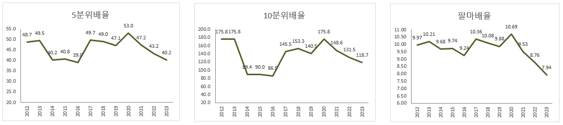 - 5분위배율 최고 26.1(’15) → 최저 23.7(’19), 팔마비율 최고 4.04(’12) → 최저 3.58(’19)