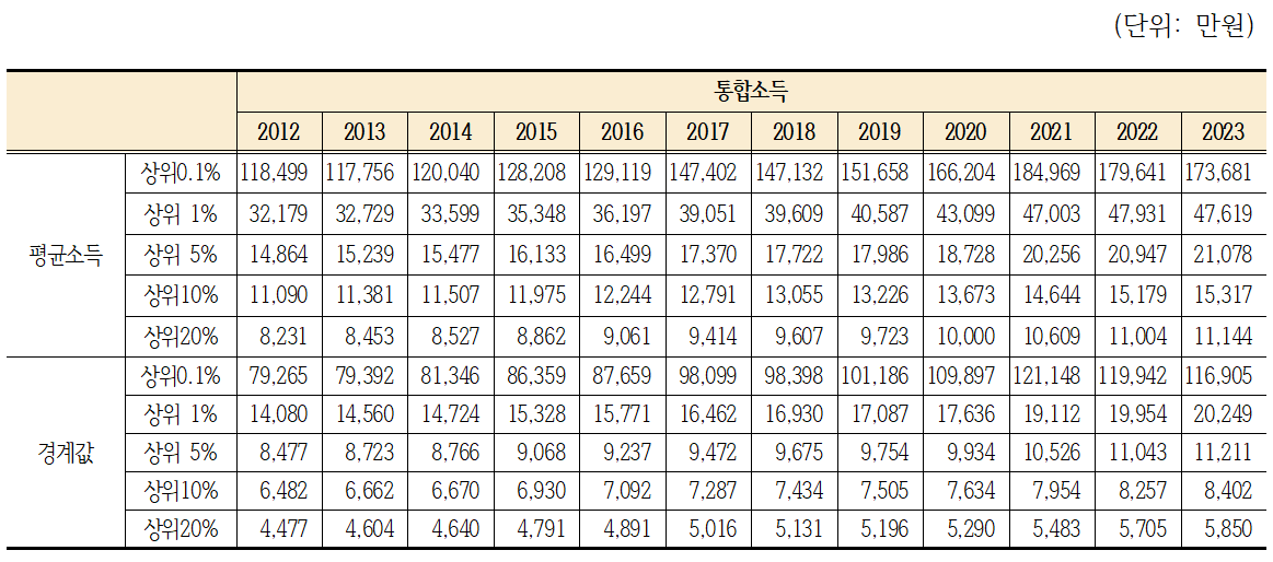 근로소득과 종합소득을 인별로 합산한 통합소득 기준 최상위0.1%의 평균소득은 17억 3,681만원이며, 상위1%는 4억 7,619만원, 상위5%는 2억 78만원, 상위10%는 1억 5,317만원, 상위20%는 1억 1,144만원의 평균소득 수준을 보였음