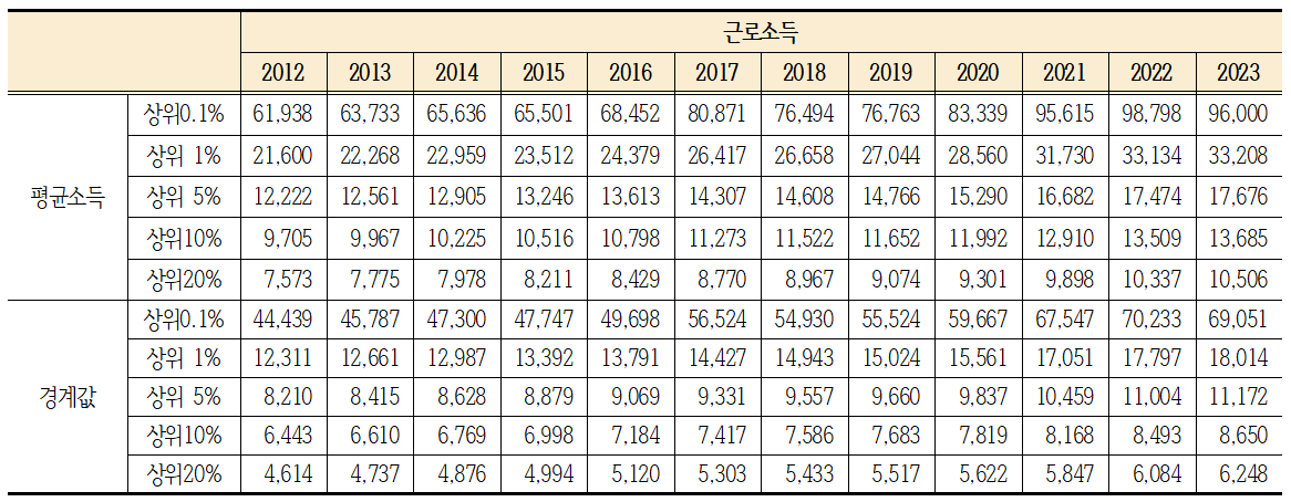 상위0.1%에 속하기 위한 소득경계값은 11억 6,905만원이었으며, 상위1%에 속하기 위해서는 2억 249만원, 상위5%는 1억 1,211만원을 넘어야 했음. 상위10%의 소득경계값은 8,402만원이고 상위20%에 속하기 위해서는 5,850만원을 넘어야 함