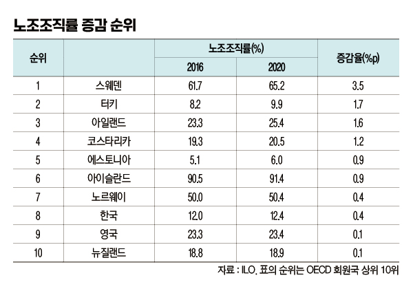 2016년 이후 노조조직률이 증가한 나라는 손에 꼽을 정도이다. 국제노동기구(ILO) 138개 회원국 중 2016년 이후 노조조직률이 증가한 나라는 25개국에 불과하다. 경제협력개발기구(OECD) 회원국으로 폭을 좁히면 38개 회원국 중 스웨덴·아일랜드·아이슬란드·노르웨이 등 노조가 강한 나라들을 중심으로 10개국만 노조조직률 증가 흐름을 보였다. 여기에 한국이 포함된 것이다.