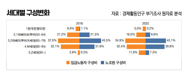 ’세대’를 기준으로 노동자와 조합원의 인적 구성 변화를 살펴보면 흥미로운 사실을 확인할 수 있다. 임금노동자 전체로 보면 베이비붐세대의 비중이 줄어들고 80년대 이후 출생한 이른바 MZ세대 비중이 2016년 35%에서 2022년 43%로 높아지는 특징을 보인다. 그런데 노조원의 세대별 비중은 이보다 더 큰 변화를 보여 MZ세대의 비중이 같은 기간 32%에서 47%로 절반에 가까운 비중을 차지하게 됐을 뿐만 아니라, 1% 미만 수준이던 95년 이후 출생 Z세대의 비중도 7%를 넘어서게 됐다. 인구고령화가 빠르게 진행되고 있는 가운데 은퇴세대는 노조에서 완전히 빠져나가는 대신 상대적으로 젊은 세대가 노조로 유입되면서 조합원 세대교체가 진행되고 있는 것이다. 연령효과가 있기 하지만 2016~2022년 6년간 임금노동자의 평균 연령은 만 44.7세에서 47.4세로 2.7세 늘었으나 노조원의 평균연령은 43.1세에서 44.4세로 1.3세 늘었을 뿐이다.