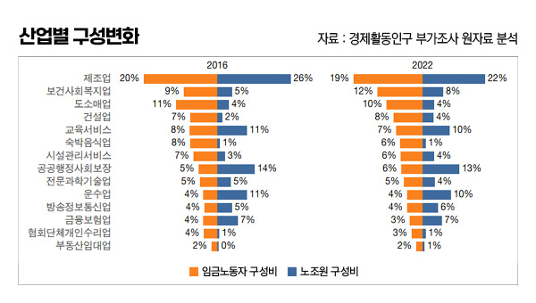 우리나라 임금노동자의 산업별 고용 비중을 보면 제조업이 1위(20%)이고, 도소매업(11%), 교육서비스업(8%), 숙박음식업(8%) 순서로 이어진다. 노조원의 구성 비중에서 1위는 제조업(23%)으로 동일하나 그 다음 비중은 공공사회보장(14%), 교육서비스(11%), 운수업(11%) 순으로 차이가 난다. 2016~2022년 제조업과 도소매업의 고용 비중은 1%포인트 줄고 보건복지업의 비중이 3%포인트 늘었다. 건설업과 공공사회보장행정의 비중이 각각 1%포인트 늘어났다. 그런데 노조원의 제조업 비중은 감소했지만 공공행정과 운수업에서는 임금노동자 비중 변화를 그대로 따라가지 않았다. 대신 보건복지업과 건설업, 정보통신업, 시설관리업이 임금노동자 비중 변화에 민감하게 반응했다. 특히 보건복지업과 정보통신업은 노조원 비중이 증가하면서 비중 순위까지 상위로 밀고 올라간 것이 눈에 띈다.