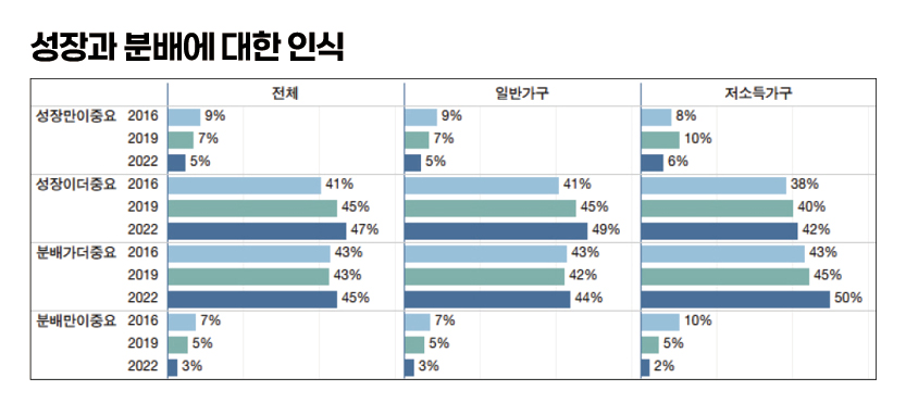 우선 성장과 분배에 대해서 어느 것이 더 중요한지에 대한 응답은 2013년 조사에서는 50:50으로 동일했던 것이 2019년에 52:48로 성장 쪽으로 약간 기울었고, 2022년에도 그대로 유지됐다. 일반가구와 저소득가구(균등화중위소득의 60%이하 가구)로 구분해서 보면, 같은 기간 두 그룹 모두 성장만이 중요하다거나 분배만이 중요하다는 응답은 감소하고 성장이나 분배가 상대적으로 중요하다는 중간 의견 쪽으로 이동한 것으로 나타난다. 대신 저소득가구에서는 분배가 상대적으로 더 중요하다는 의견이 43%에서 50%로 늘어난 반면, 일반가구에서 성장이 더 중요하다는 입장이 41%에서 49%로 크게 강화된 것으로 나타난다.
