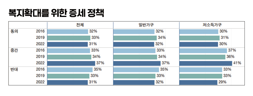 사회복지를 확대하려면 세금을 더 거둬야 한다는 의견에 대해서는 찬성 비율이 크게 달라지지는 않았으나(32%→33%→31%), 반대 비율이 다소 줄어든 것(35%→33%→31%)으로 나타났다. 이러한 증세 반대 의견 약화는 저소득가구와 일반가구에 공통적으로 나타났다.