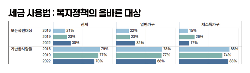 하지만 이것은 일반 가구가 다수를 차지하는 상황을 반영하는 것일 뿐 저소득 가구의 경우에는 전 국민 대상 복지가 옳다는 의견이 2016년 15%에서 2019년 26%로 크게 늘었다가 2022년에 오히려 17% 수준으로 크게 줄어들었다. 소득하위 50%(25%→34%)와 소득하위 70%(11%→18%) 대상이 옳다는 의견이 강화된 것으로 나타난다. 이것은 문재인 정부 시기 기초생활보장이나 근로장려세제의 확대나 코로나 위기 당시 정부지원금 지급 등의 복지수급 경험이 반영된 것으로 보인다. 일반가구에서는 동일한 경험을 해도 복지혜택이 일부에게만 가서는 안 된다는 인식을 갖게 된 반면, 저소득가구는 어려운 사람들에게 좀 더 두텁게 지원해 주는 것이 옳다고 느끼게 된 것으로 이해된다.