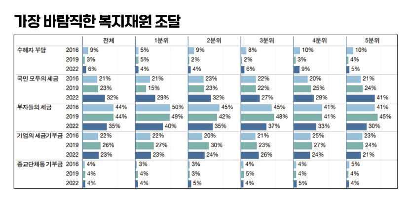 그렇다면 정작 복지에 필요한 재원의 조달에 대해서는 어떤 의견들을 가지고 있고 변화는 어땠을까? 이번 2022년 조사에서 고소득층의 세금 부담이 낮다는 의견은 59%에 달했다. 상당한 국민이 고소득층이 제대로 세금을 내지 않고 있다고 보는 것이다. 하지만 2016년에는 이 의견이 82%에 달했을 정도였으니 많이 완화한 것이다. 반면 중간층의 세금 부담이 낮다는 응답은 6년 전 17%에서 8% 수준으로 줄어들었으며, 저소득층의 세금 부담이 낮다는 의견은 8%에서 12%로 오히려 늘었다. 소득계층에 따른 조세부담 정도에 대한 인식차이가 있지만 한편으로는 그 차이가 좁혀지고 있는 측면을 보여준다. 이와 관련해서 복지패널 부가조사에서는 “노인, 아동, 장애인 등을 위한 복지재원을 어떻게 마련하는 것이 가장 바람직한가”라고 물었는데 2016년에는 부자(44%), 기업(22%), 모든 국민(21%) 순이었다. 그러나 2022년에는 부자(35%), 모든 국민(32%), 기업(23%) 순으로 바뀌었다. 수혜자 부담으로 해결해야 한다는 응답은 9%에서 6%로 줄었다.
