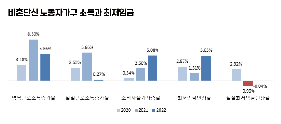 1인 노동자가구의 소득에서 근로소득은 절대적인 비중을 차지한다. 그리고 저소득 가구일수록 최저임금과 소비자물가의 변화에 큰 영향을 받는다. 2021년 최저임금은 코로나19 위기 상황에서 결정됐다. 인상률은 1989년 최저임금제도가 시행된 이후 가장 낮은 1.5%였다. 그리고 2022년 최저임금인상률은 5.1%로 회복됐지만 이번에는 가파른 물가상승의 압박에 직면했다. 그 결과 최저임금의 실질가치는 2021년 -0.96%, 2022년 -0.04%로 하락해 2년 연속 마이너스를 기록하는 상황에 놓이게 됐다.