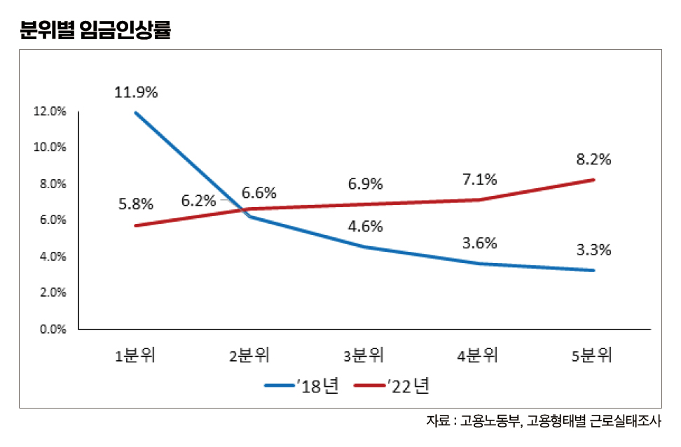 고용노동부가 24일 발표한 고용형태별 근로실태조사에서 임금분배지표가 악화로 반전한 것도 이런 상황과 무관하지 않다. 2017년 이후 5년 연속 감소하던 저임금 노동자 비중이 2022년 증가한 것으로 나타났고, 2015년 이후 지속하던 5분위배율의 하락세도 2021년에 멈춘 뒤 2022년 다시 상승한 것으로 나타났다. 최저임금이 16.4% 인상됐던 2018년 하위 20% 노동자의 임금이 11.9% 상승할 때 상위 20%의 임금인상은 3.3%에 그쳤다. 저임금계층일수록 높은 임금인상이 이뤄졌지만, 2022년에는 하위 20%의 임금인상률이 물가상승률의 5.8%에 그친 대신, 고임금으로 갈수록 임금인상률이 높아지는 역전 현상이 발생한 것이다. 이런 상황에서 임금분배가 나빠지는 것은 어쩌면 당연한 결과다.