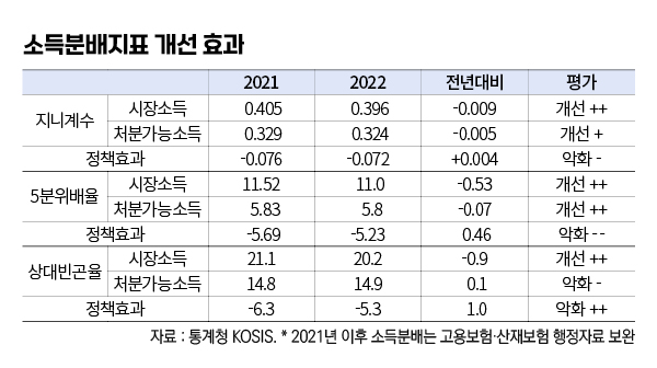 소득분배 개선효과는 당해연도의 시장소득 분배지표와 처분가능소득 분배지표의 차이로 정의된다. 실제로 2022년 처분가능소득 지니계수는 2021년의 0.329에서 0.324로 개선했으나 이것은 시장소득 기준 지니계수가 0.405에서 0.396으로 개선한 것에 비하면 정부의 정책효과는 오히려 퇴보한 것으로 볼 수 있다. 5분위배율도 전년대비 지표는 개선했으나 시장소득 불평등이 축소된 효과보다는 처분가능소득의 분배개선 효과는 그에 못미친다. 상대빈곤율의 경우 시장소득 빈곤율은 줄어들었지만(21.1%→20.2%) 처분가능소득에서는 빈곤율이 오히려 증가(14.8%→14.9%)한 것으로 나타난다. 빈곤완화에 대한 정부 정책의 기여가 없는 것으로 충분히 해석할 수 있다.