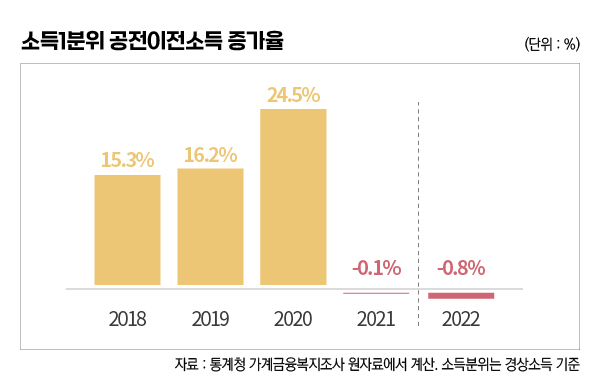 코로나 사태의 한복판에 있었던 2020년에도 연간기준으로는 플러스 증가를 보였던 가계실질소득이 마이너스를 기록한 것은 물가상승과 함께 비소비지출에 포함되는 이자 지급액(+18.3%)이 크게 증가한 반면 정부로부터 받는 공적이전소득(-4.7%)이 크게 감소했기 때문이다.