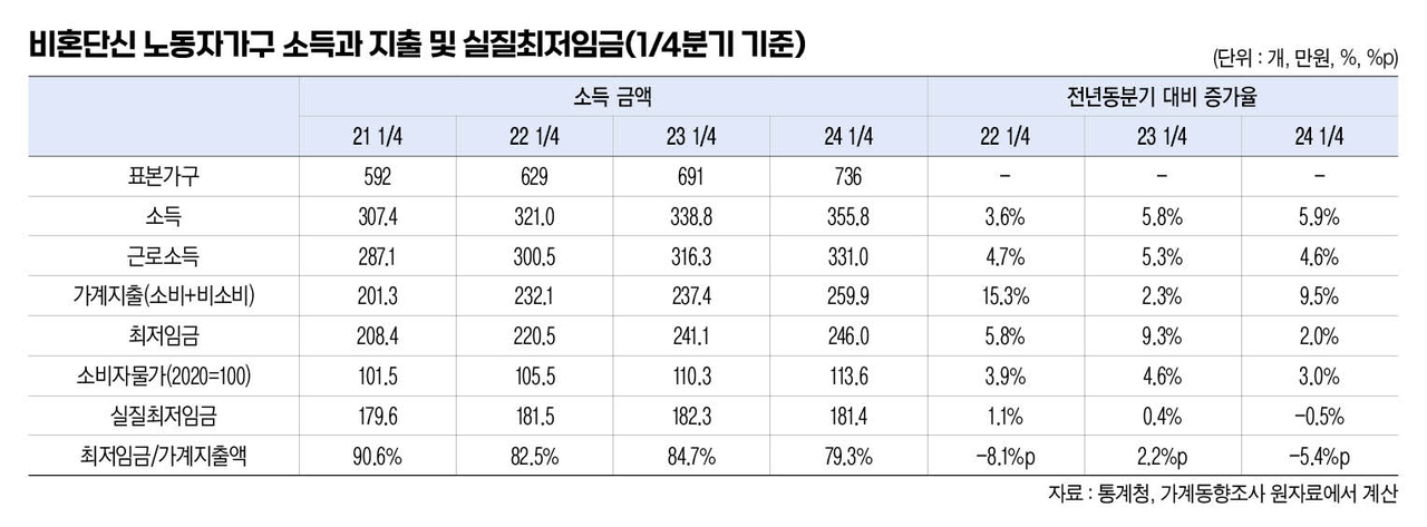 마침 지난달 25일 올해 1분기 가계동향조사 결과가 발표됐기 때문에 가장 최신 자료로 최저임금와 동일한 기준의 비혼단신 노동자가구의 소득과 지출, 그리고 현 시점에서 물가상승을 감안한 최저임금의 가치를 확인해 볼 수 있다. 표본가구수는 분기 자료이기 때문에 2024년 1분기 기준 736개 표본가구가 분석대상이다.