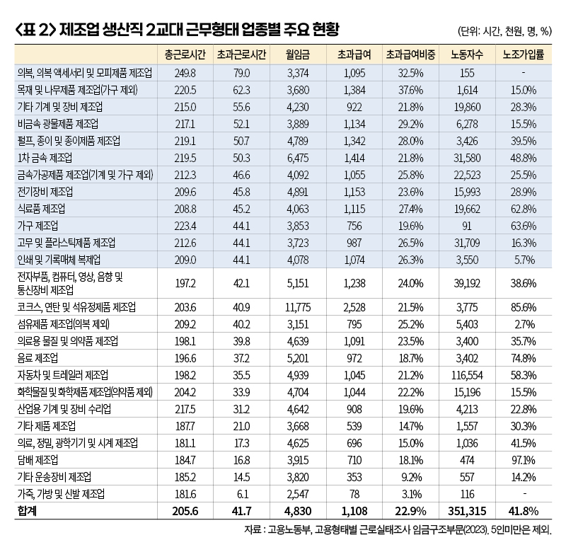 2교대 근무자의 절반에 가까운 48.4%가 제조업에 속해 있고, 그중 생산직이 34만3천명으로 2교대 근무자의 94.8%를 차지한다. 이 통계가 작성된 2008년 이후 전 산업의 2교대 비중은 6.1%에서 4.4%로 줄었지만 제조업 생산직은 2008년 15.4%였던 것이 2023년에도 여전히 15.7% 수준을 유지하고 있다.